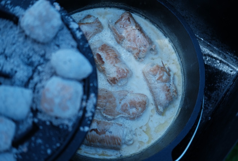 Jetzt müssten eure Briketts soweit sein, um sie auf eine Feuerfeste Unterlage zu schütten. Dann stellt ihr euren Dutch Oven darauf und lasst ihn gut heiß werden. Nun gebt ihr euer Butterschmalz hinein und lasst es schmelzen. Dann wandern eure Rouladen in den Dutch Oven, bratet sie von allen Seiten schön an. Sie sollten schon eine schöne Farbe bekommen. In der Zwischenzeit verrührt ihr die Sahne, Schmand, den restlichen Kräuterfrischkäse, 200 ml Hühnerfond mit einer guten Prise Salz und Pfeffer.